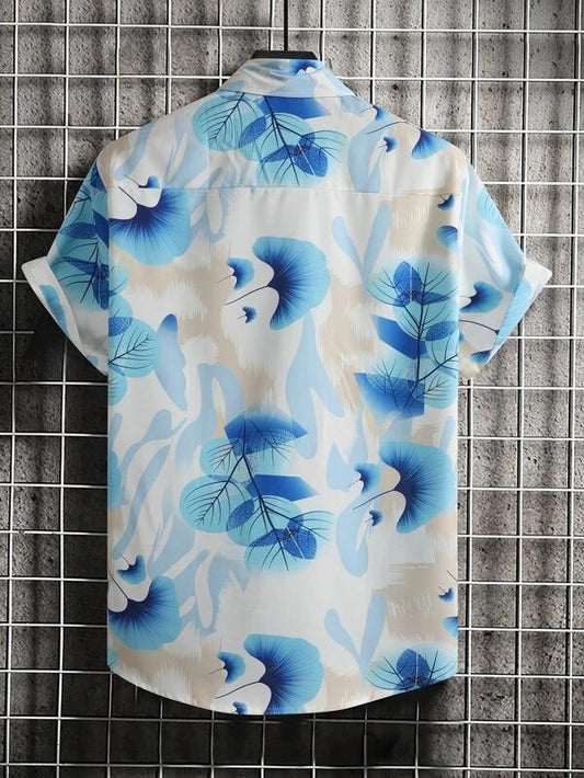 White and Blue Rose Pattern Printed Cotton Shirt Half Sleeves for Men
