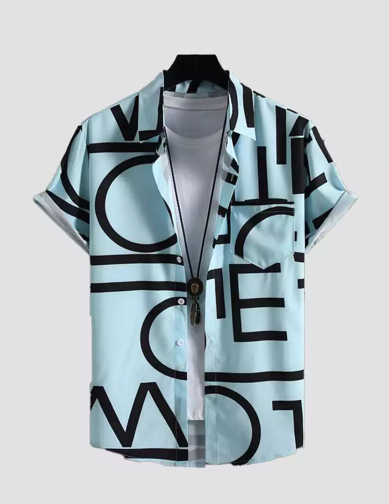 Alphabet Print Shirt With Patched Pocket and Half Sleeve Beach Wear Sky blue color RoscoeShirts